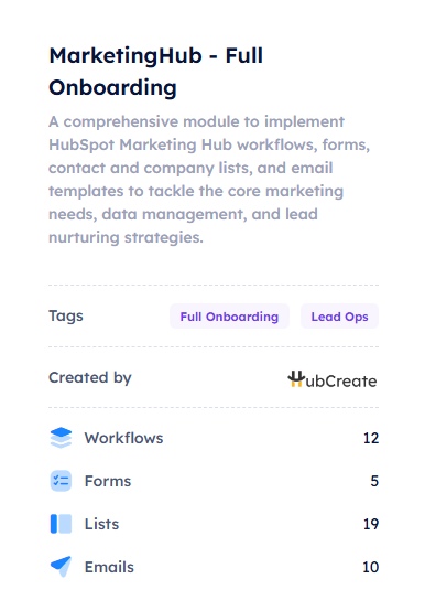 HubCreate comes with a growing library of pre-built asset packages designed by CRM and RevOps professionals. From lifecycle automation to lead nurturing, these packages follow industry best practices and are ready to deploy into your clients' HubSpot portals — saving you hours of setup.